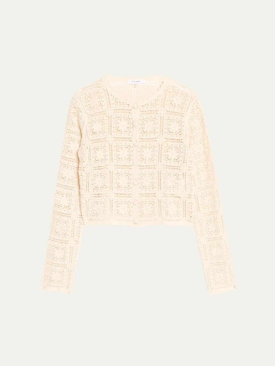 FRAME cotton crochet cardigan Scoop neckline Long sleeves Classic fit Hem sits at the hip Button-front Cotton Imported Online Inquiries: BGS21_T6Q5J| Store Inquiries: #5023610