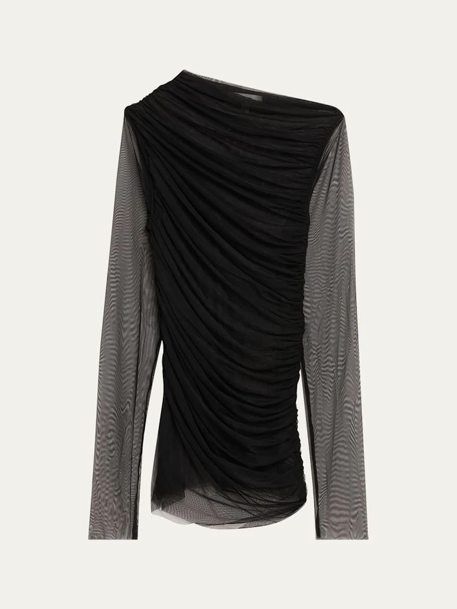 FRAME soft mesh top adorned with flattering draping Asymmetric neckline Long sleeves Slim fit Hem sits at the hip Pullover style Elastane Dry clean Imported