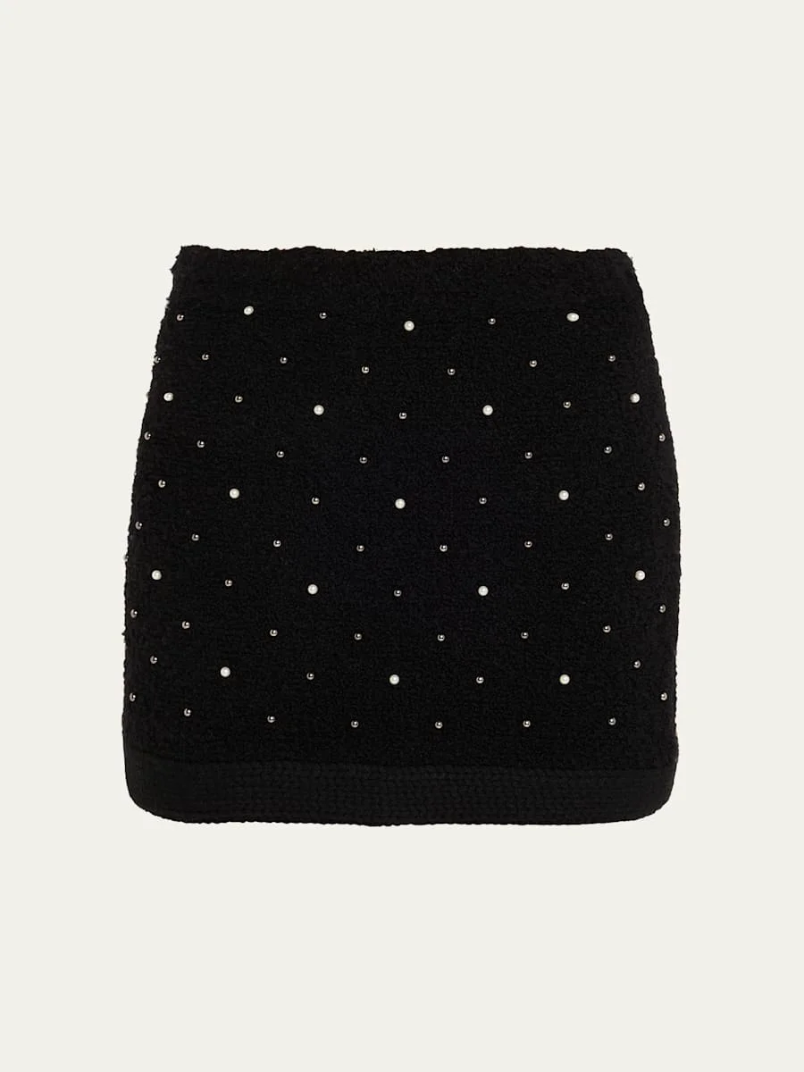 Knitted in a soft wool blend, this FRAME mini skirt is adorned with shimmering rhinestones and pearls High rise Elasticized waistband Skirt falls straigth from hip to hem Hem falls above the knee Pullon style Wool/nylon/polyamide Dry clean only Imported