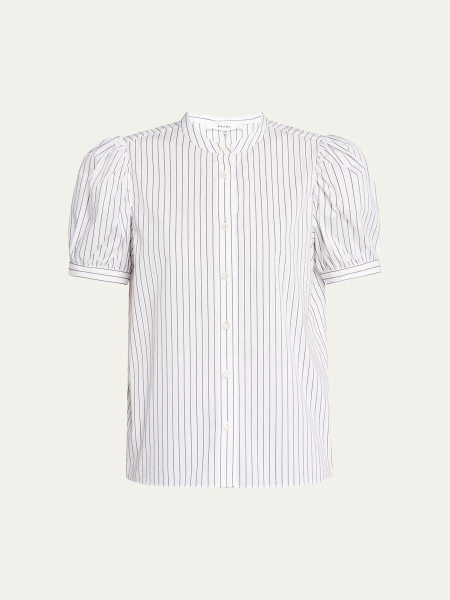 FRAME pinstripe top featuring gathered puff sleeves High neckline Short sleeves Classic fit Hem falls to the hip Button-front Cotton/nylon/polyamide/spandex Machine wash cold Imported Online Inquiries: BGS21_T6HQA| Store Inquiries: #4989975
