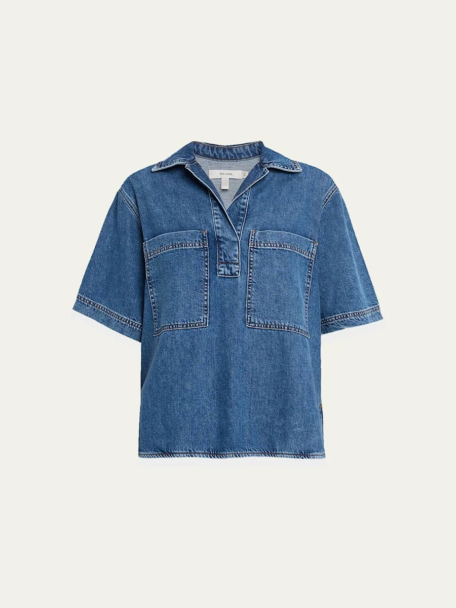 FRAME "The Hi-Low" shirt in medium-wash denim Point collar; V neckline Short sleeves Dual chest pockets Relaxed fit Rounded high-low hem Pullover style Organic cotton/lyocell Machine wash cold, inside out Imported Online Inquiries: BGS21_T6TT1| Store Inquiries: #5034141