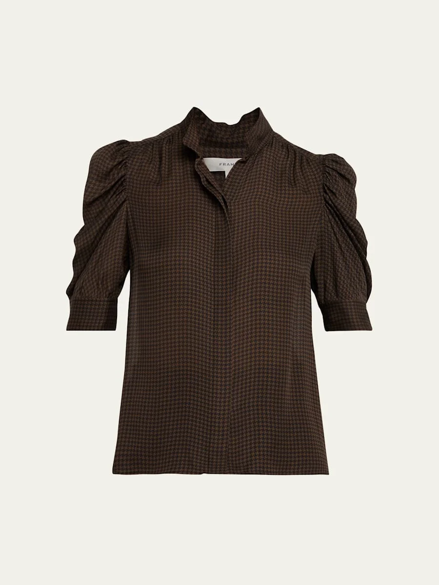 FRAME luxurious silk blouse in houndstooth Spread collar Ruched sleeves Classic fit Hem falls to the hip Hidden buttonfront Silk Imported