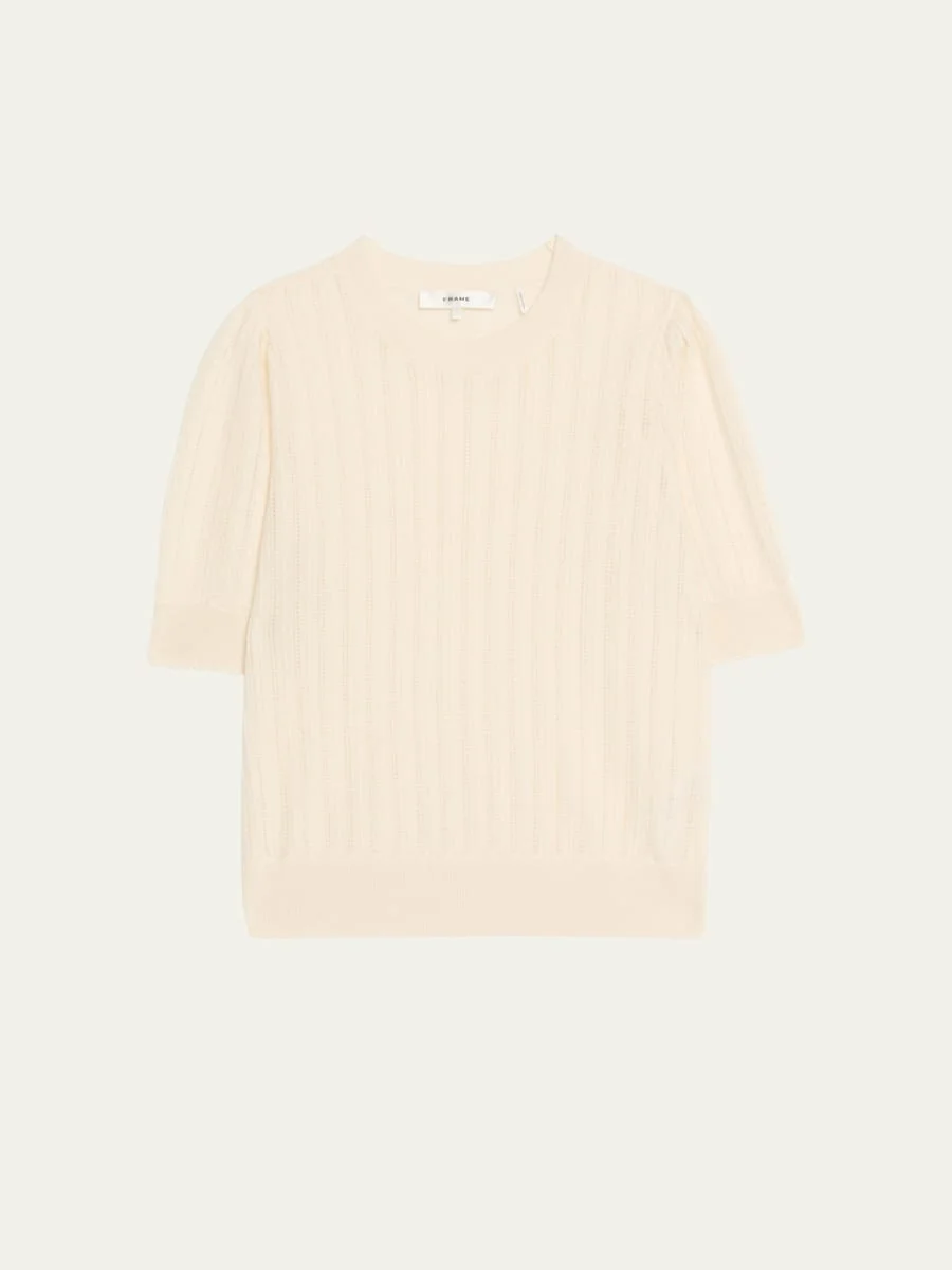 FRAME pointelle sweater crafted in luxurious cashmere Crew neckline Short sleeves Classic fit Hem sits at the hip Pullover style Cashmere Dry clean Imported Online Inquiries: BGS21_T6YG0| Store Inquiries: #5067531