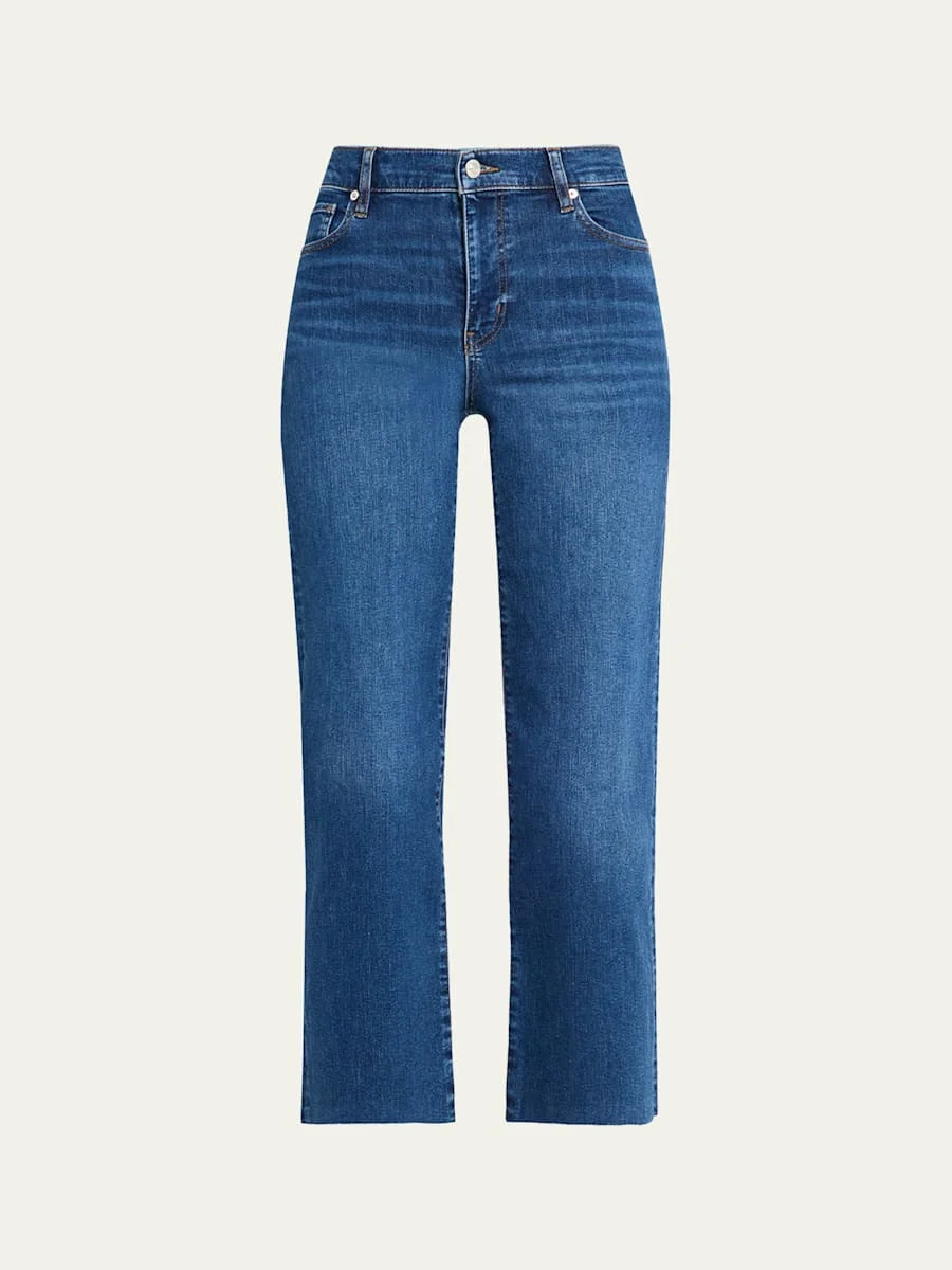 FRAME "The Mellow" jeans finished with a raw hem in mediumwash denim Approx. 27.5" inseam Midrise; sits high on the hip Fivepocket style Wide legs Ankle length Button/zip fly; belt loops Cotton/polyester/lyocell Machine wash inside out Imported