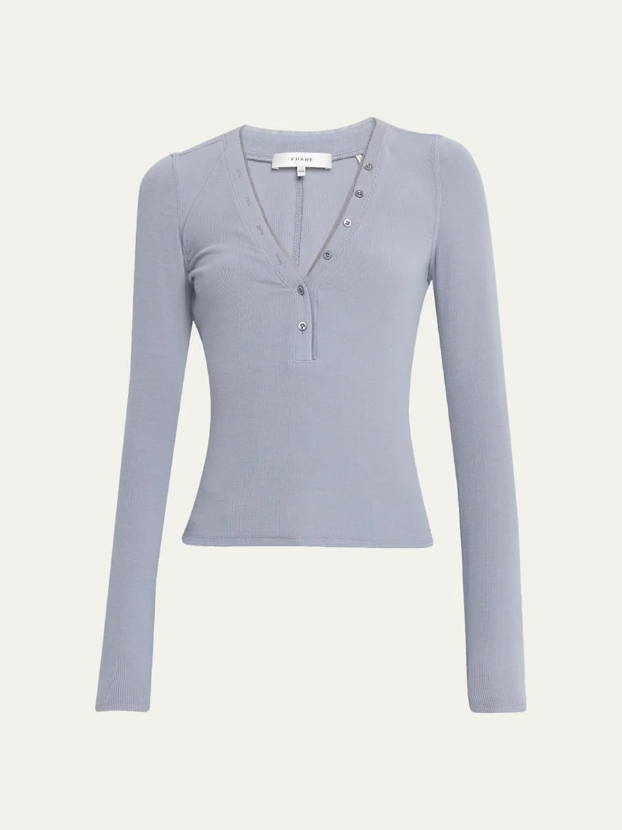 FRAME ribbedknit Henley top finished with mesh trim along the neckline Long sleeves Easy fit Hem sits at the hip Pullover style Modal/spandex Hand wash or dry clean Imported