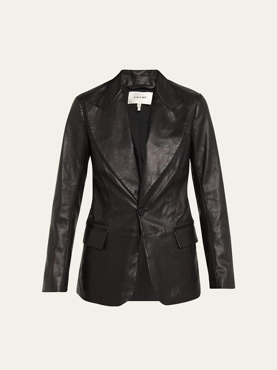Crafted in smooth lambskin leather, the Peak Lapel Blazer by FRAME features a sleek silhouette that can be dressed up or down for any occasion. Peak lapels Single-breasted front Long sleeves with button cuffs Chest welt pocket Hip flap pockets Tailored fit Double-vented back Button-front Leather Leather method dry cleaning Imported Online Inquiries: BGS21_T6W2W| Store Inquiries: #5048123