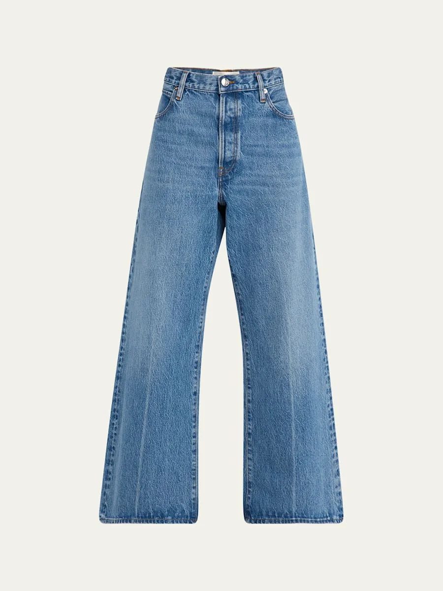 FRAME "The Pixie Loose" wideleg jeans in mediumwash denim Approx. 12" rise; 29" inseam Lowrise; sits at the hip Fivepocket style Loose fit with a subtle flare Full length Button/zip fly; belt loops Cotton Machine wash cold inside out, lay flat to dry Imported