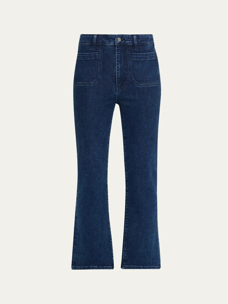 FRAME "The Reboot Crop Modernist Pocket" bootcut jeans in superstretch denim Approx. 11" rise; 27" inseam High rise Front and back patch pockets Fitted through the hip and thigh Cropped length Button/zip fly; belt loops Cotton/lyocell Machine wash cold Imported