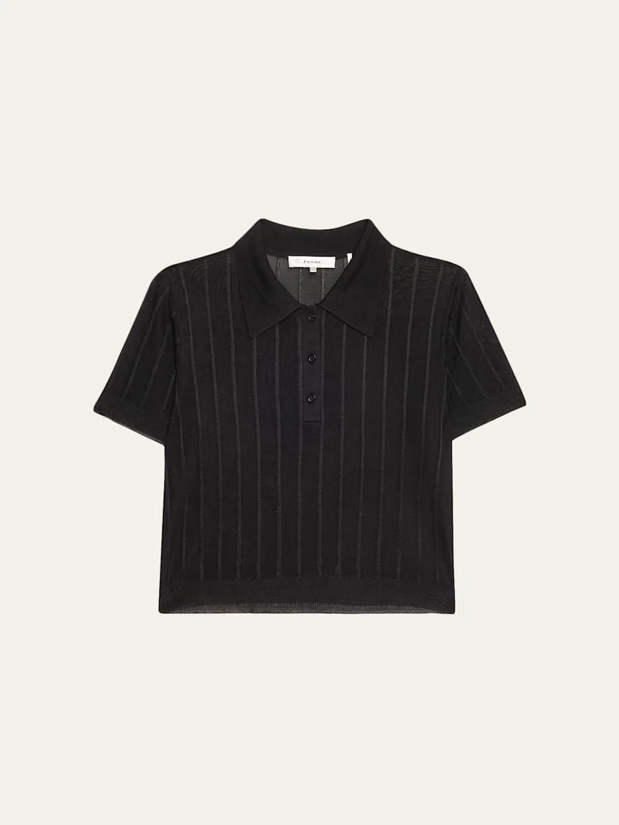 FRAME lightweight ribbed polo shirt Point collar; button-placket Short sleeves Classic fit Cropped length Pullover style Viscose Imported Online Inquiries: BGS21_T6RBN| Store Inquiries: #5025463
