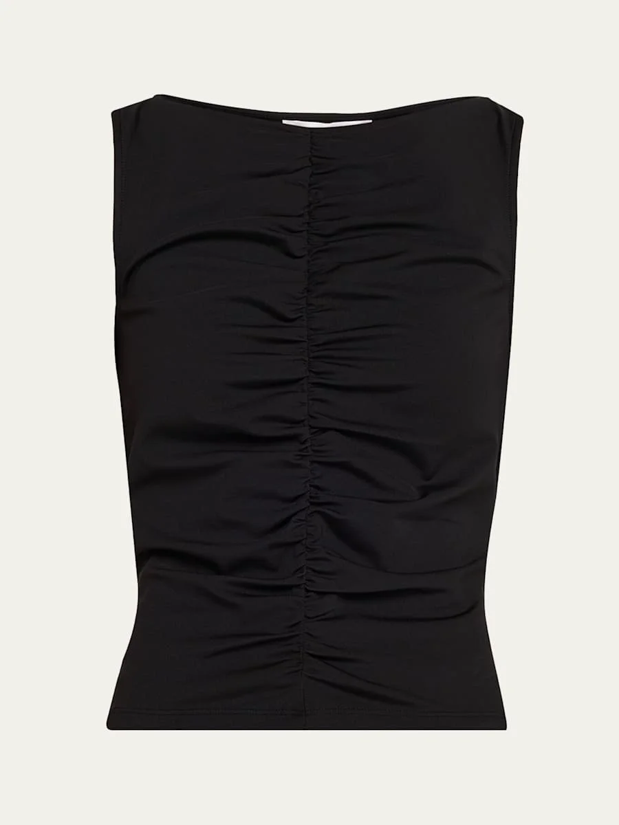 FRAME stretch knit top with center ruching for added flair High neckline Sleeveless Easy fit Hem sits at the hip Pullover style Polyester/elastane Machine wash cold or dry clean; lay flat to dry Imported Online Inquiries: BGS21_T6TRR| Store Inquiries: #5034095