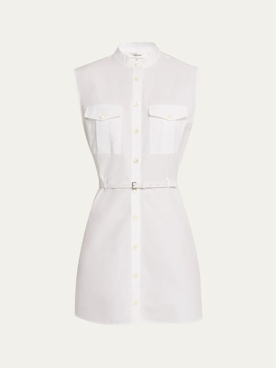 FRAME "The Safari" mini dress featuring a belted waist High neckline Sleeveless Dual chest pockets Shirtdress silhouette Hem falls above the knee Button-front Cotton Machine wash cold Imported Online Inquiries: BGS21_T6HPZ| Store Inquiries: #4989963