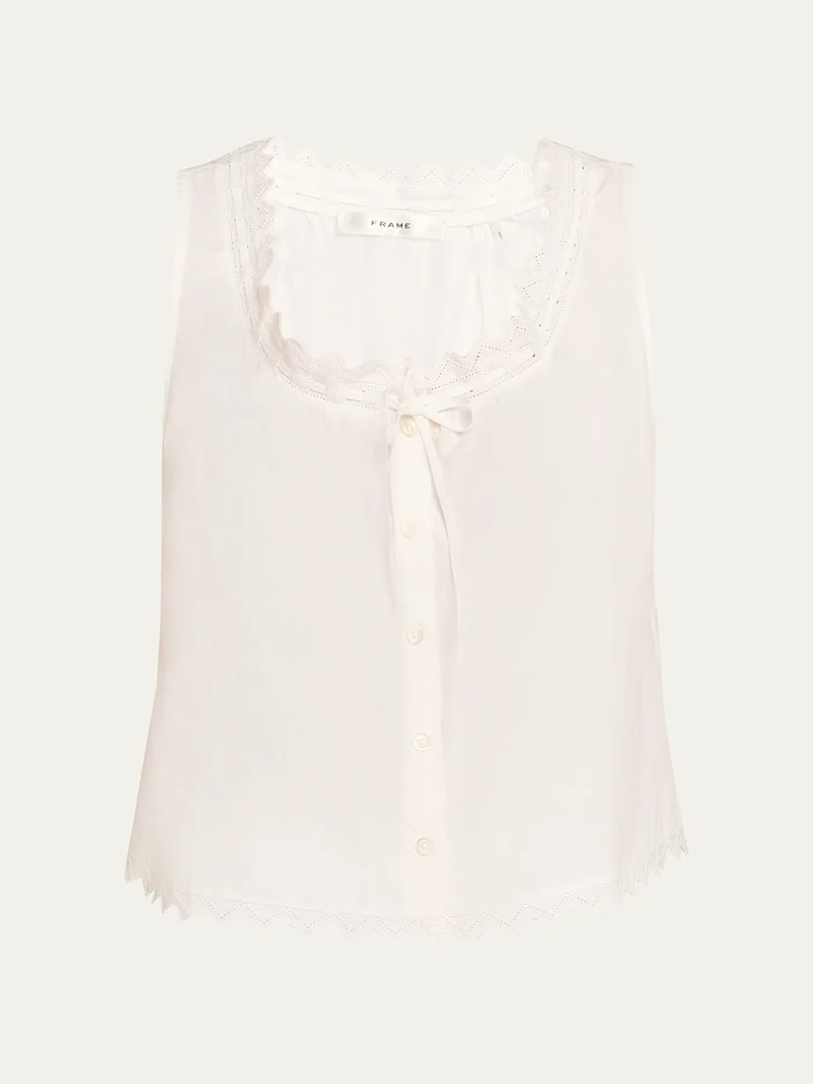 FRAME "Serene" crisp cotton top detailed with delicate scalloped trim Scoop neckline with selftie Sleeveless Classic fit Hem falls to the hip Pullover style Cotton Imported SIZE amp; FITModel measurements: 5'10" tall Model is wearing a US size 4/Small