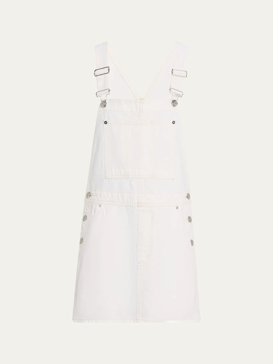 FRAME "The Skirtall" mini dress in crisp white denim Square neckline Adjustable buckle straps Chest pocket Four-pocket style Shift silhouette Hem falls above the knee Side button closure Cotton Machine wash cold Imported Online Inquiries: BGS21_T6TSW| Store Inquiries: #5034134