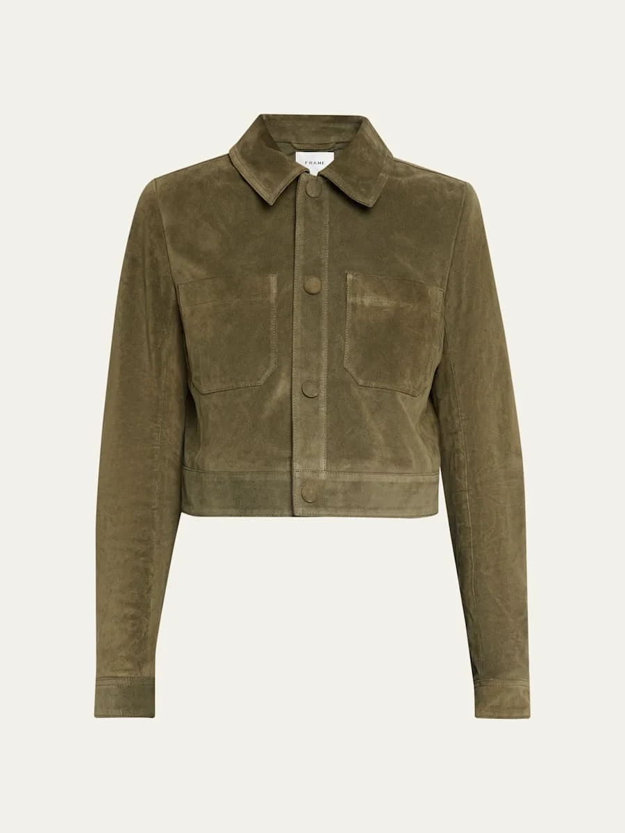 Crafted in supple calf suede, the small suede jacket by FRAME is a bestselling style with covered buttons and a clean silhouette. Spread collar Long sleeves Dual chest pockets Boxy fit Cropped length Buttonfront Leather Leather method dry cleaning Imported