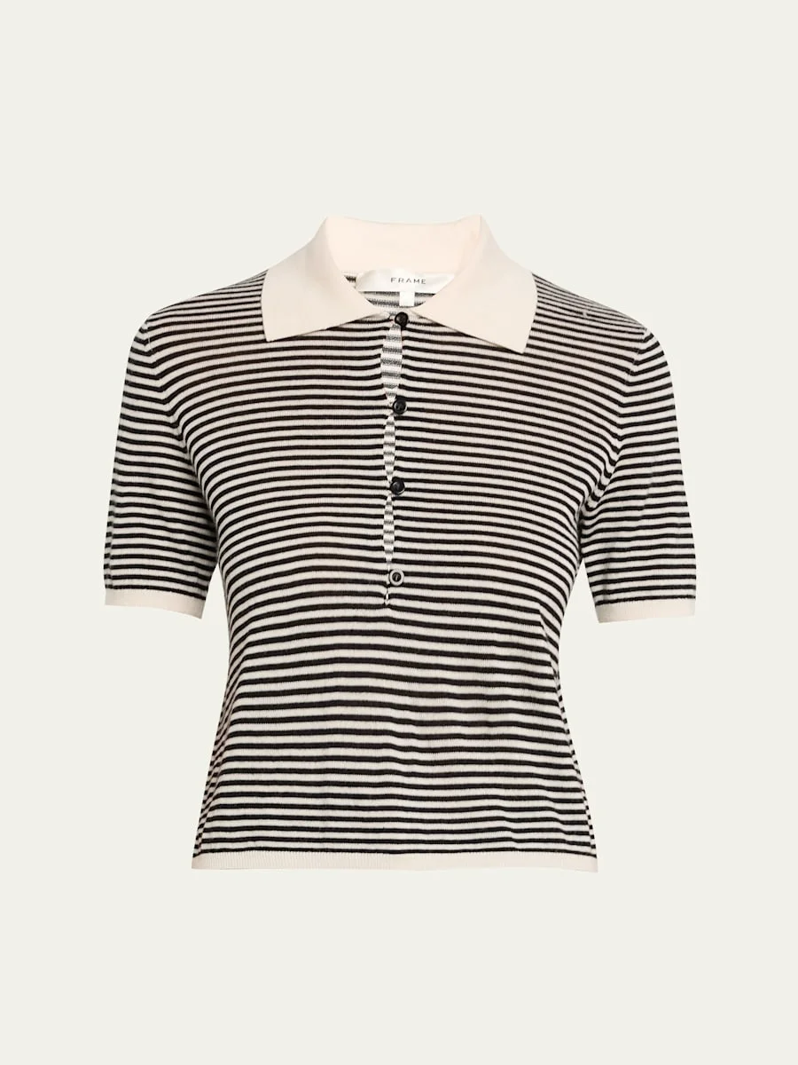 Crafted in superfine merino wool, the "Smart" polo by FRAME features a two-tone stripe with solid trim for a polished finish. Spread collar; button-placket Short sleeves Classic fit Hem sits at the hip Pullover style Wool Dry clean Imported Online Inquiries: BGS21_T6VPY| Store Inquiries: #5044765