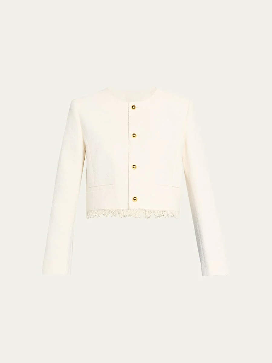 FRAME tweed jacket finished with a fringe hem Round neckline Long sleeves Welt pockets Tailored fit Hem sits at the hip Button-front Cotton/polyester Dry clean only Imported Online Inquiries: BGS21_T6TRV| Store Inquiries: #5034099