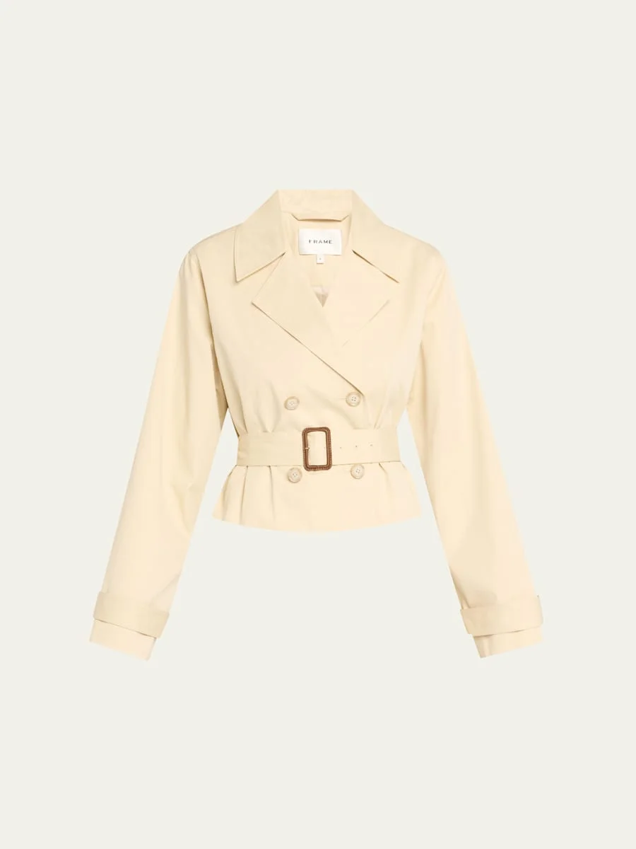FRAME cropped trench coat Notched collar Double-breasted front Long sleeves with belted cuffs Adjustable belt Classic fit Hem sits at the hip Button-front Cotton Dry clean Imported Online Inquiries: BGS21_T6Q5G| Store Inquiries: #5023608