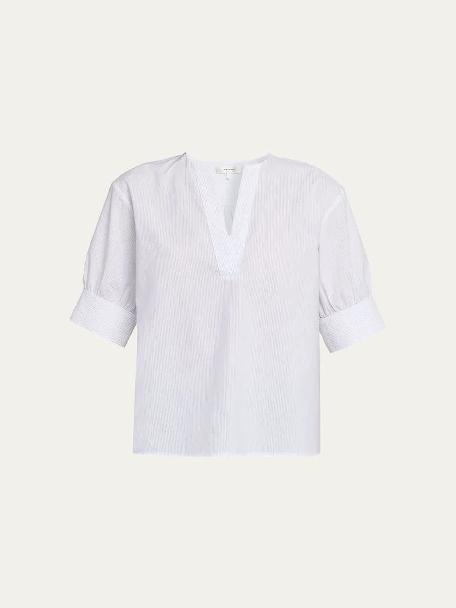Crafted from a cotton and linen blend, the V-Neck Popover by FRAME is a go-to piece to complete your seasonal wardrobe. V neckline Short sleeves with button cuffs Classic fit Hem falls to the hip Pullover style Cotton/linen Machine wash gentle or dry clean Imported Online Inquiries: BGS21_T6TS9| Store Inquiries: #5034113
