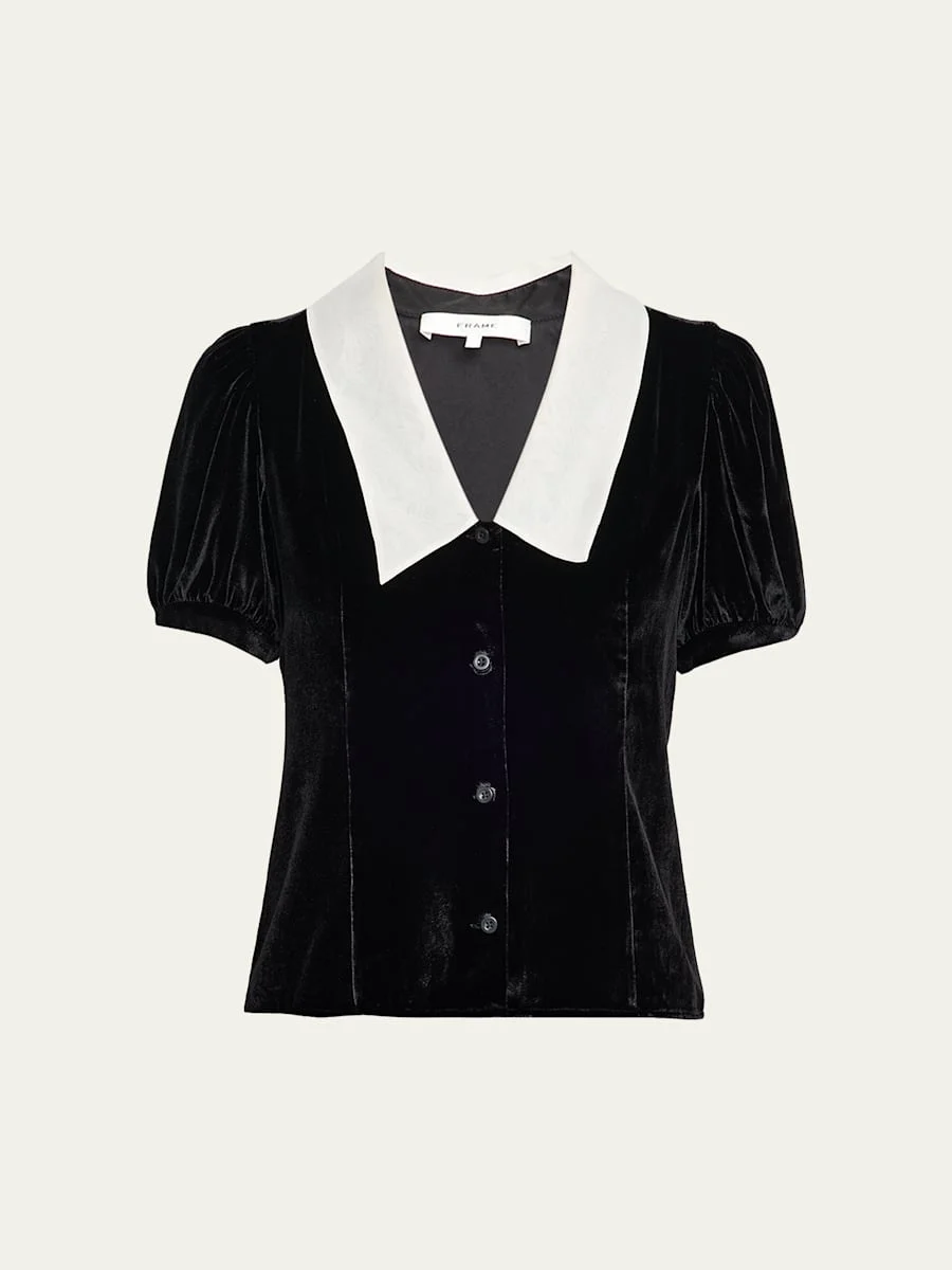 FRAME top cut from velvet and anchored by a contrast collar Approx. 22"L from shoulder to hem Sailor collar Short puff sleeves Hip length Slim fit Button front placket Rayon/cellulose acetate/silk/spandex Dry clean Imported