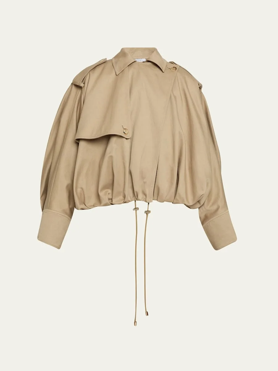 Gabriela Hearst "Hunt" trench jacket Spread collar; off-centered button closure Long sleeves; belted cuffs Shoulder epaulets Gun flap and storm shield Oversized fit Drawcord hem Cotton Made in Italy Online Inquiries: BGS21_B9WCQ| Store Inquiries: #4986729