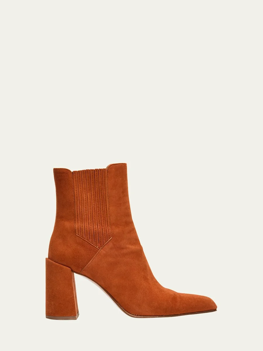 Gabriela Hearst "Luke" suede booties 3.50 in / 90 mm block heel Pointed toe Elastic gored sides Pull-on style Leather outsole Lining: Unlined Made in Italy Online Inquiries: BGS21_X6X9M| Store Inquiries: #5033266