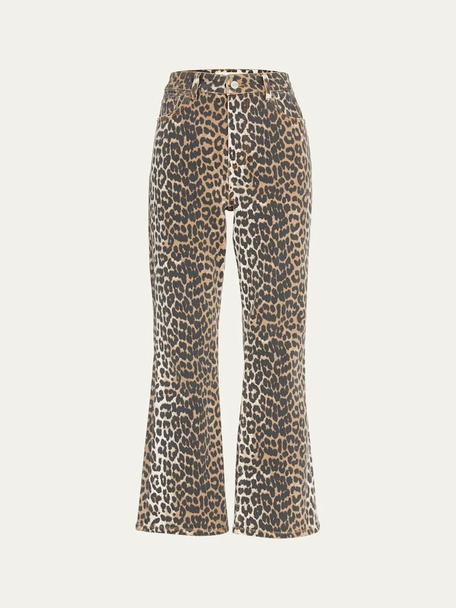 Ganni "Betzy" leopard printed cropped bootcut jeans Five-pocket style High-rise Fitted through the hip; flared from the knee Button/zip fly; belt loops Organic cotton/elastane Machine wash cold Imported Model is 5'10"/177cm. Online Inquiries: BGS21_T5VCZ| Store Inquiries: #4325481