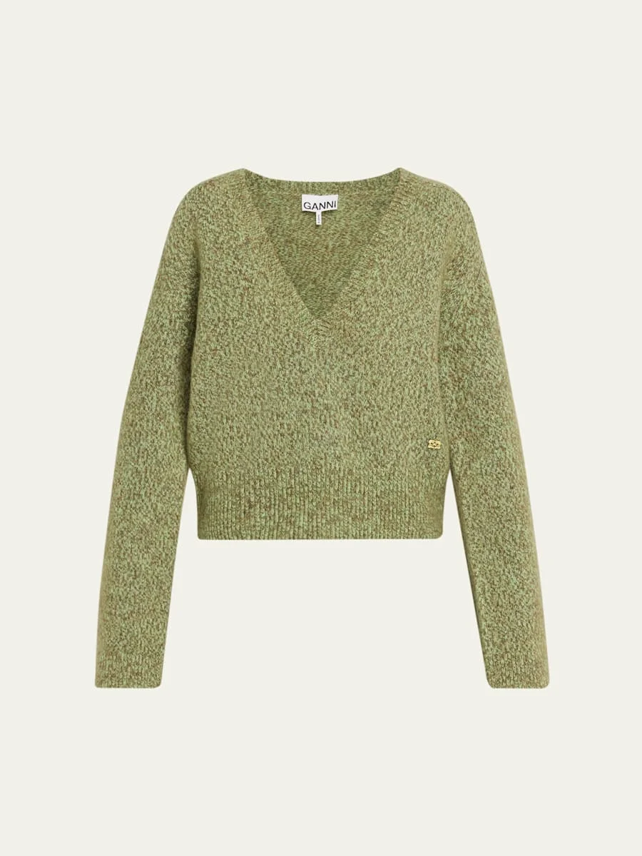 Ganni melange sweater in cozy brushed mohair wool V neckline Long sleeves Relaxed fit Pullover style Wool/mohair/recycled ocean plastic Machine wash cold Imported