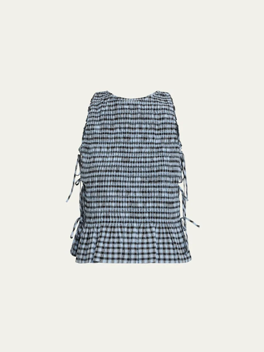 Ganni seersucker top finished with self-tie sides in check Crew neckline Sleeveless Fitted Peplum hem Pullover style Organic cotton Machine wash cold Imported Online Inquiries: BGS21_T6LQ0| Store Inquiries: #5008647