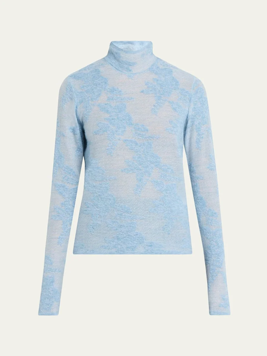Ganni turtleneck top crafted from sheer floralprint jacquard with a soft handfeel. Long sleeves Classic fit Hem sits at the hip Back keyhole closure Wool/nylon/polyamide Dry clean only Made in Italy