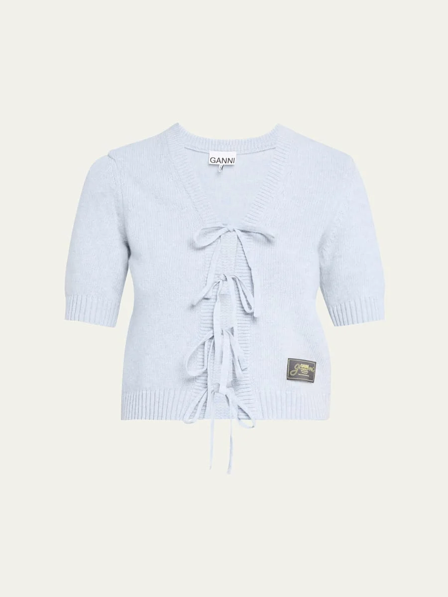 Ganni soft wool-blend cardigan finished with a tie-front V neckline Short sleeves Classic fit Cropped length Wool/viscose Hand wash Imported Online Inquiries: BGS21_T6RHD| Store Inquiries: #5026223
