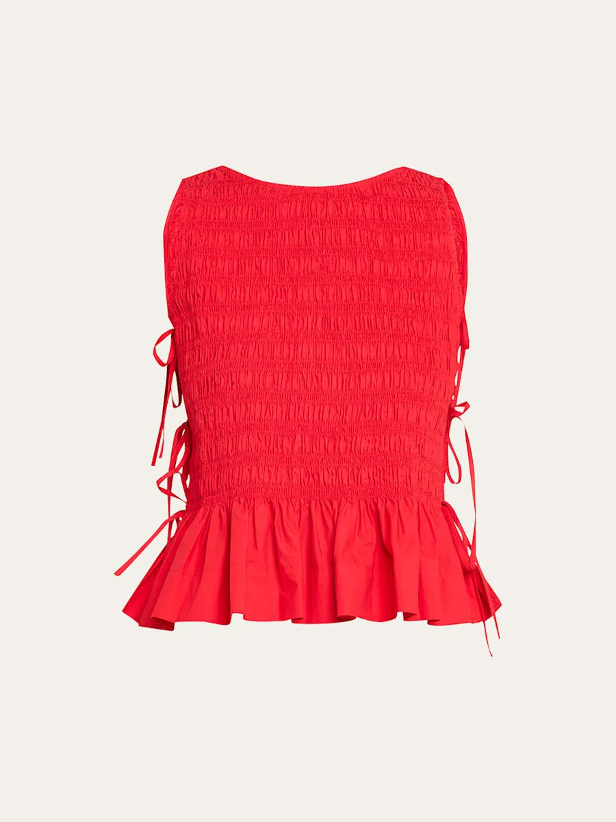 Ganni smocked cotton-poplin top finished with self-tie sides Crew neckline Sleeveless Classic fit Peplum hem Organic cotton Machine wash cold Imported Online Inquiries: BGS21_T6RH7| Store Inquiries: #5026217