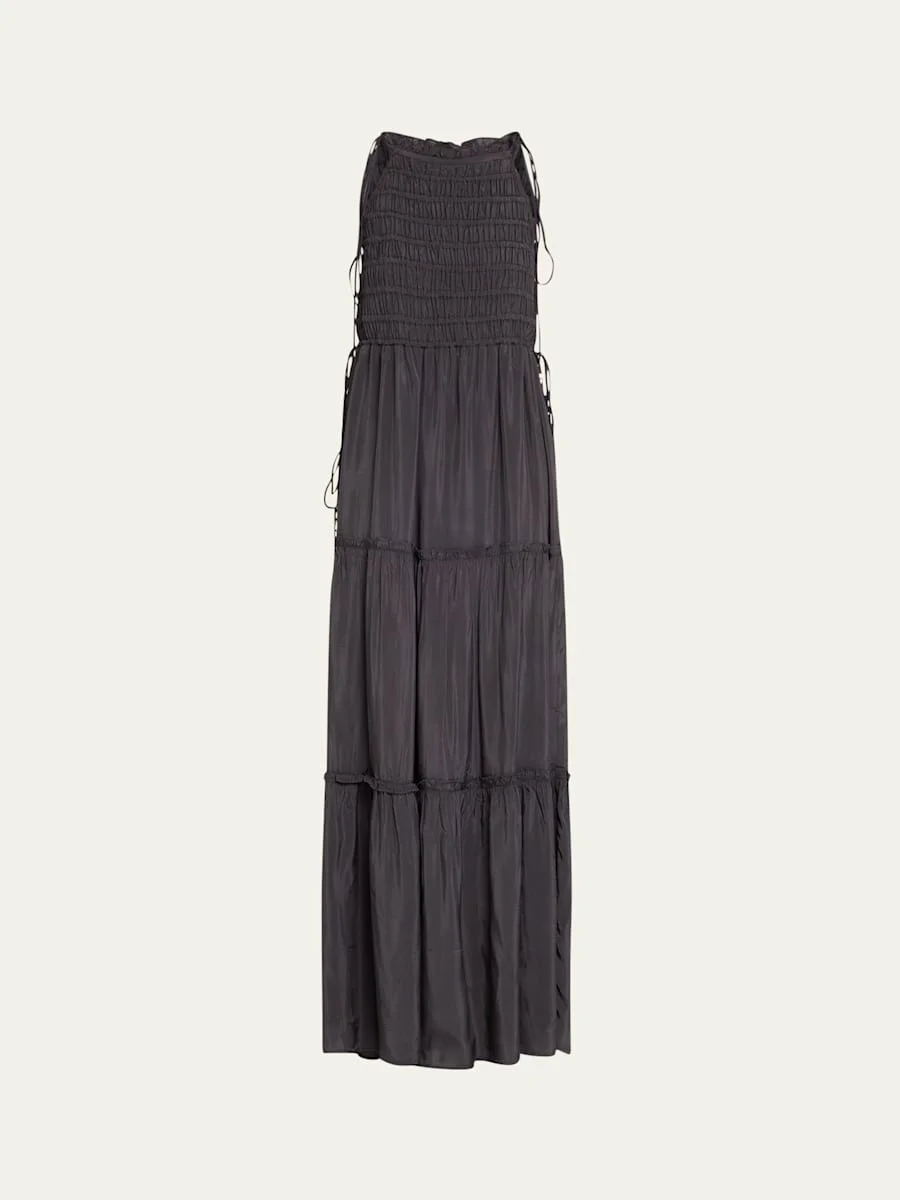 Ganni smocked maxi dress finsihed with a tiered hem High neckline Self-tie straps Slip silhouette Full length Slipover style Viscose Machine wash cold Imported Online Inquiries: BGS21_T6RHG| Store Inquiries: #5026226