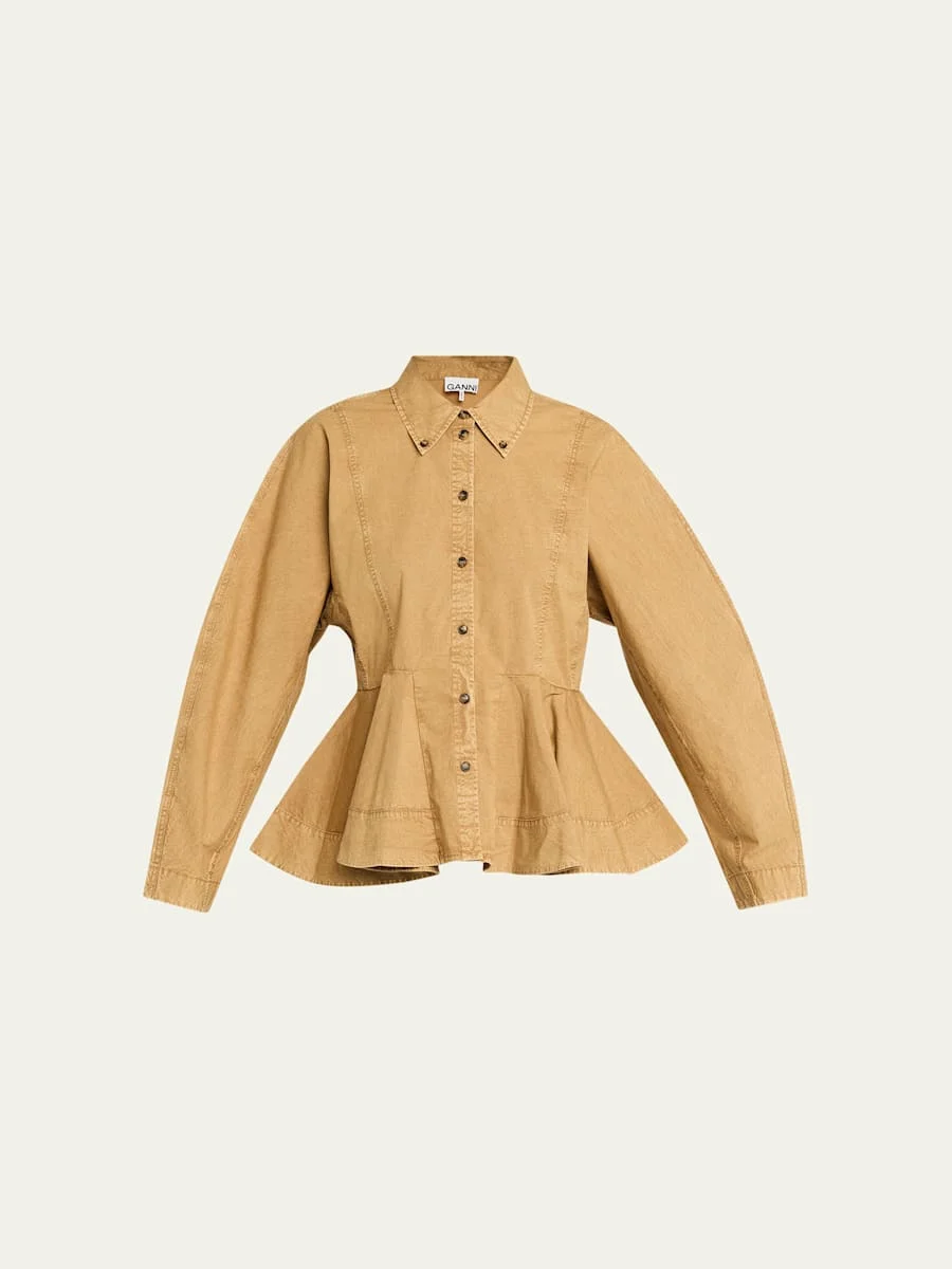 Crafted in washed stretch cotton denim, this Ganni top boasts a voluminous peplum hem for a feminine update on a classic piece. Point collar; butonfront Long sleeves with button cuffs Classic fit Hem sits at the hip Cotton/elastane Machine wash cold Imported