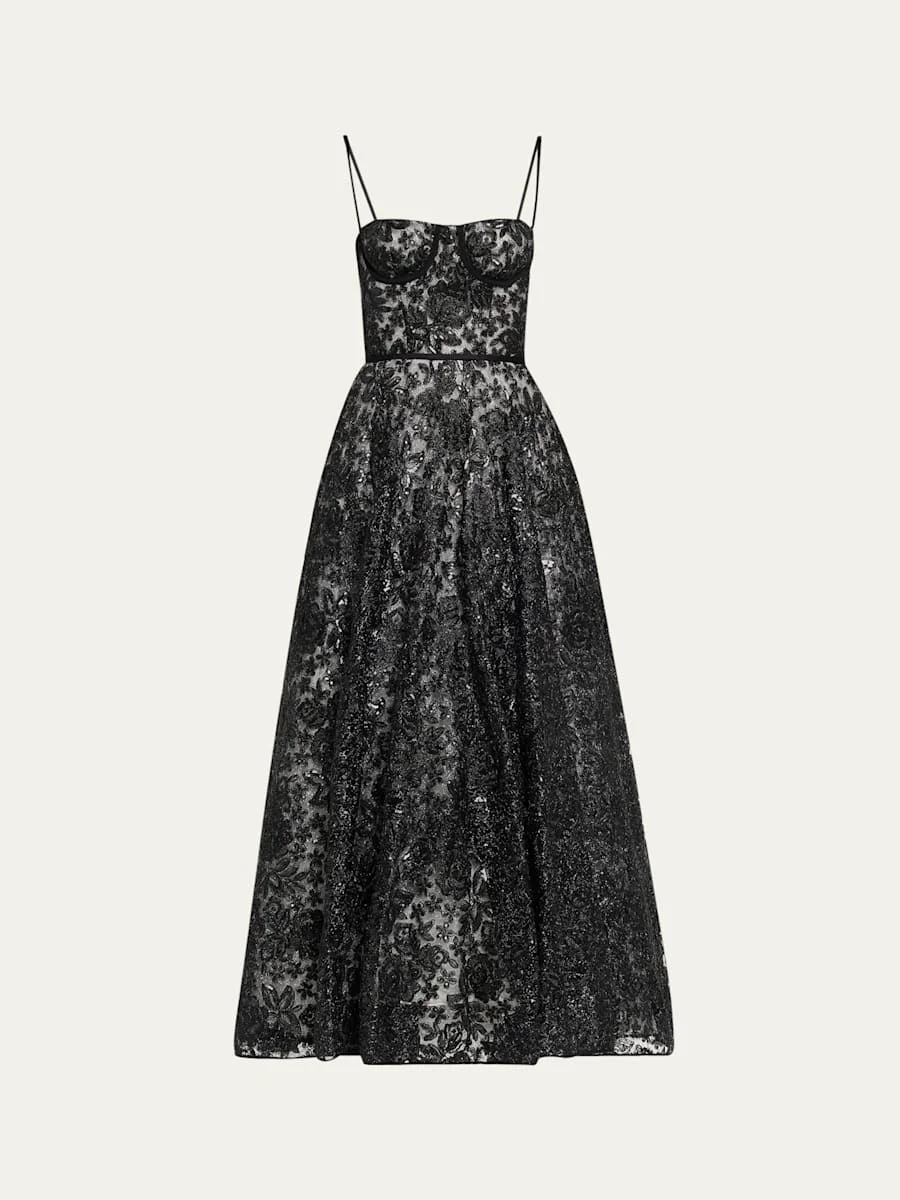 Sequined Floral Lace Bustier A-Line Maxi Dress