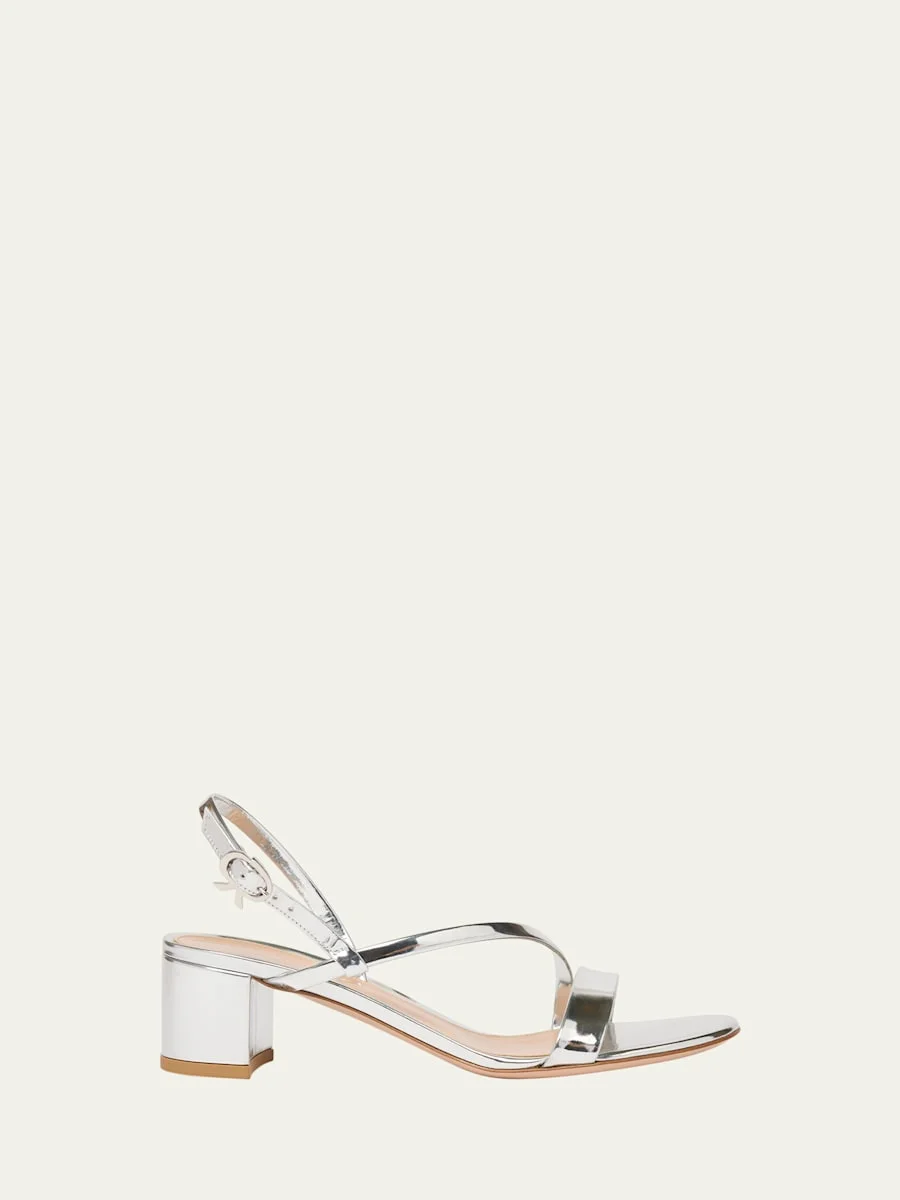 The "Betsy" sandals by Gianvito Rossi are crafted from mirroreffect leather with an asymmetrical vamp 1.75 in / 45 mm block heel Round open toe Adjustable ankle strap Leather lining and outsole Made in Italy