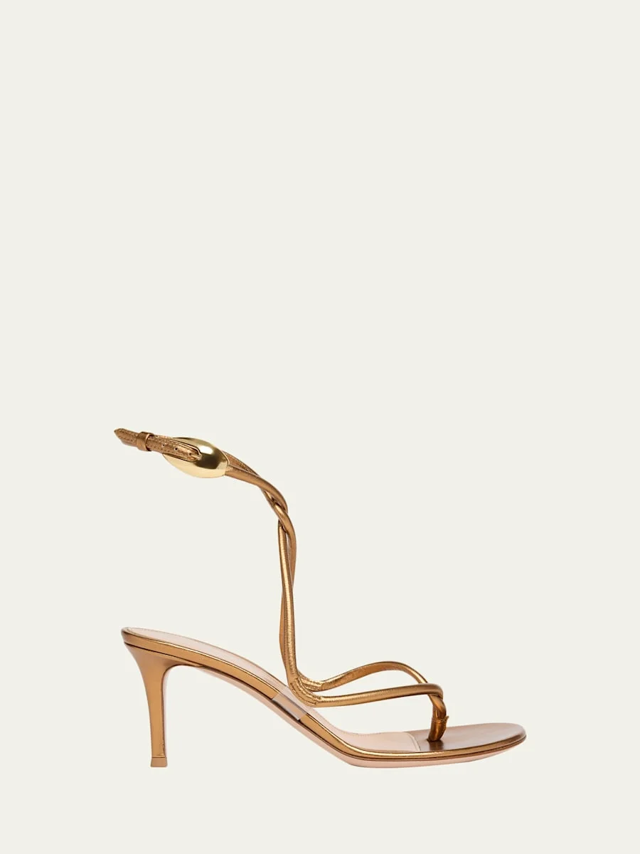 The "Jungle Mamba" sandals by Gianvito Rossi are crafted from metallic leather with a sinuous snake's coilinspired strap 3.00 in / 75 mm covered stiletto heel Open toe Thong strap Adjustable ankle strap with buckle clasp Leather lining and outsole Made in Italy