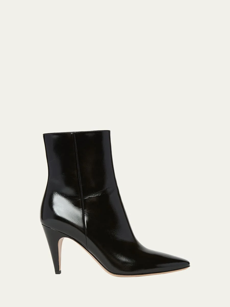 Gianvito Rossi "Amelia" booties in patent leather 3.25 in / 85 mm architectural heel Pointed toe Leather lining Side zip for easy on and off Leather outsole Spot clean Made in Italy