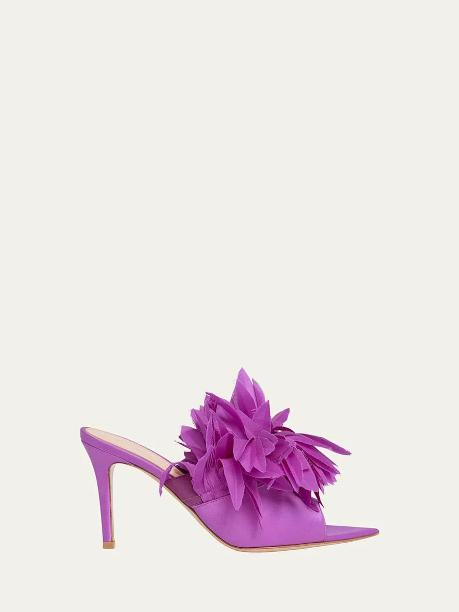 Gianvito Rossi sandals featuring a silk crepe feather embellishment 3.25 in / 85 mm stiletto heel Pointed open toe Leather lining and outsole Spot clean Made in Italy Online Inquiries: BGS21_X6TXC| Store Inquiries: #4966984