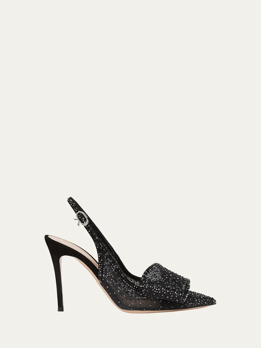 Embellished with tonal crystals, these pumps by Gianvito Rossi are crafted from calf suede with an organza upper and oversized vamp accent 3.75 in / 95 mm stiletto heel Pointed toe Adjustable ankle strap Made in Italy