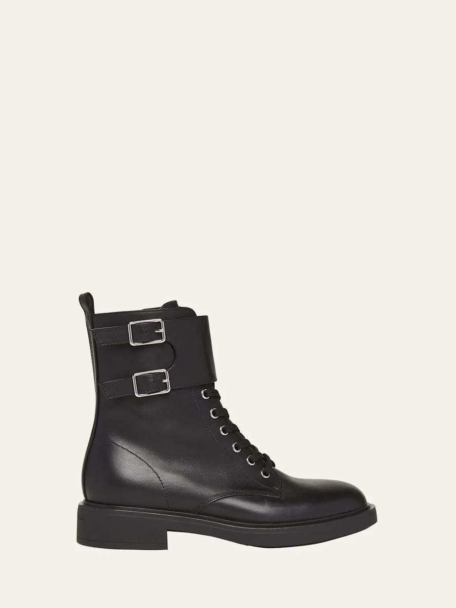 Gianvito Rossi calf leather combat booties 0.75 in / 20 mm flat heel Round toe Lace-up vamp with buckle cuff Side zip eases dress Leather outsole Lining: Leather Made in Italy Online Inquiries: BGS21_X6VVH| Store Inquiries: #5007204
