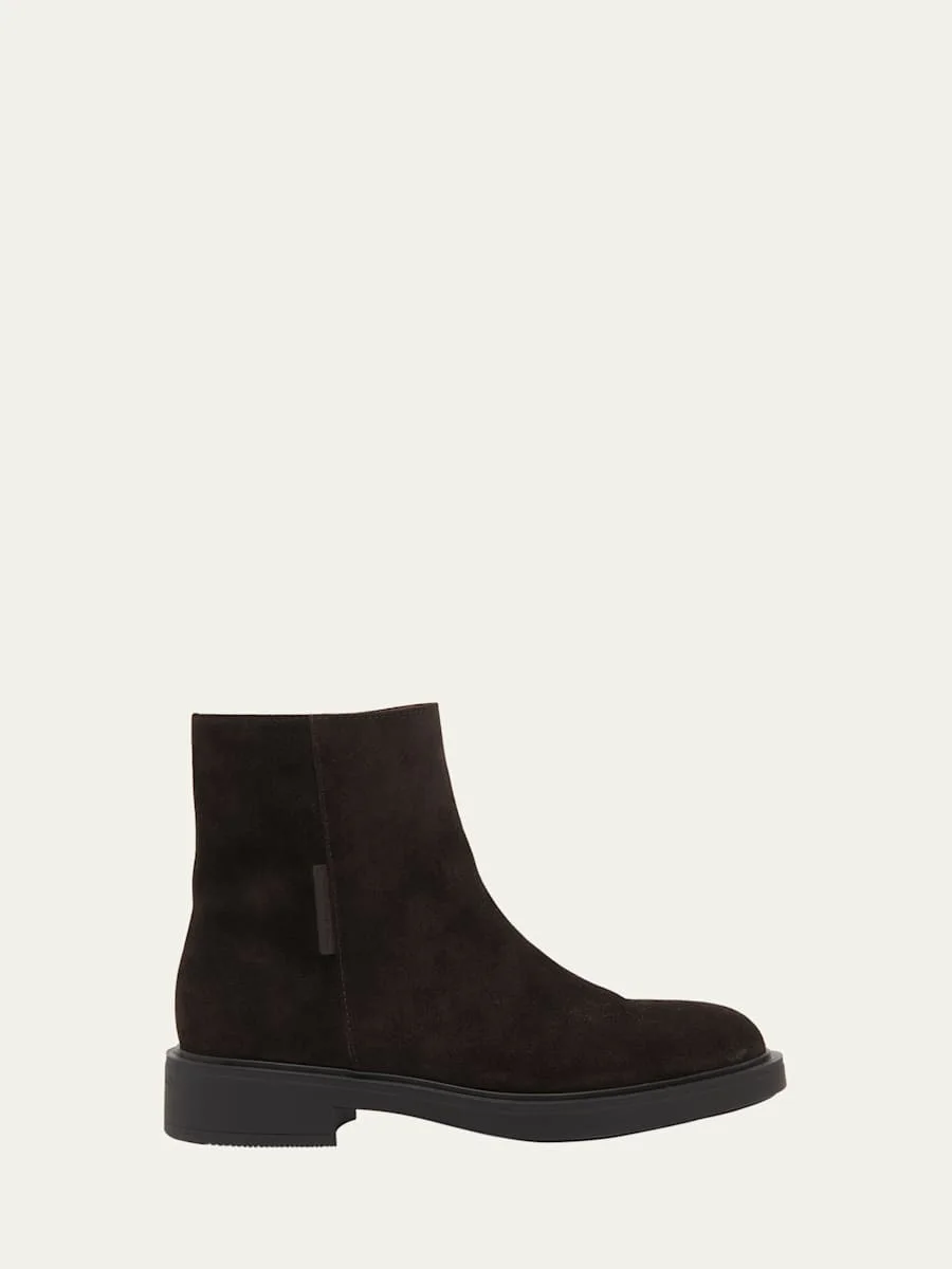 Gianvito Rossi soft calf suede ankle booties 0.75 in / 20 mm flat heel Round toe Zip closure for easy on/off Rubber outsole Lining: Leather Spot clean Made in Italy