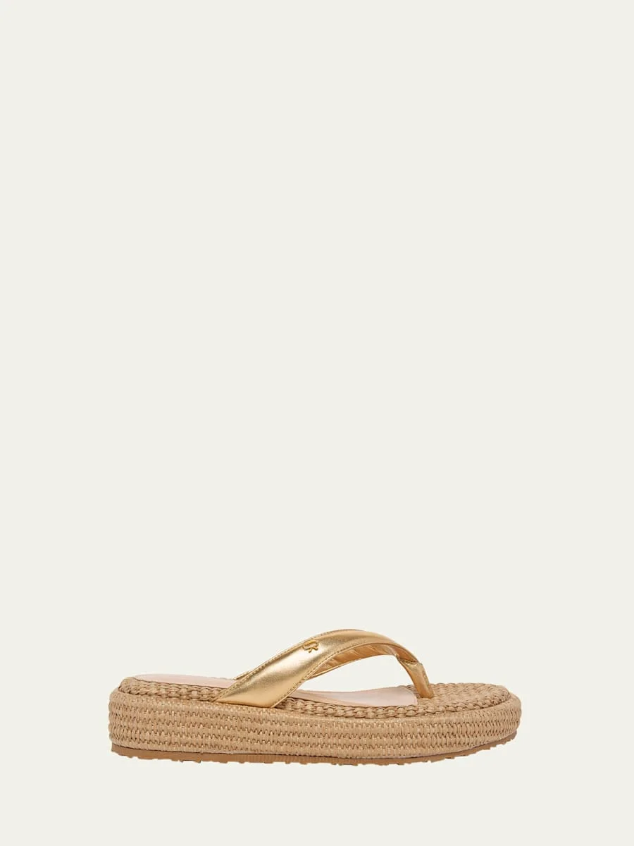 Gianvito Rossi metallic leather and woven raffia platform sandals 0.17 in / 5 mm flat heel Thong strap Slide style Rubber outsole Lining: Leather Made in Italy