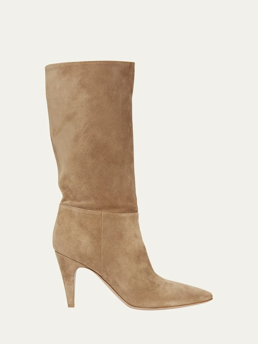 Gianvito Rossi slouchy suede mid boots 3.25 in / 85 mm thick stiletto heel Almond toe Pull-on style Leather outsole Lining: Leather Made in Italy Online Inquiries: BGS21_X6VU6| Store Inquiries: #5003324