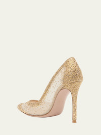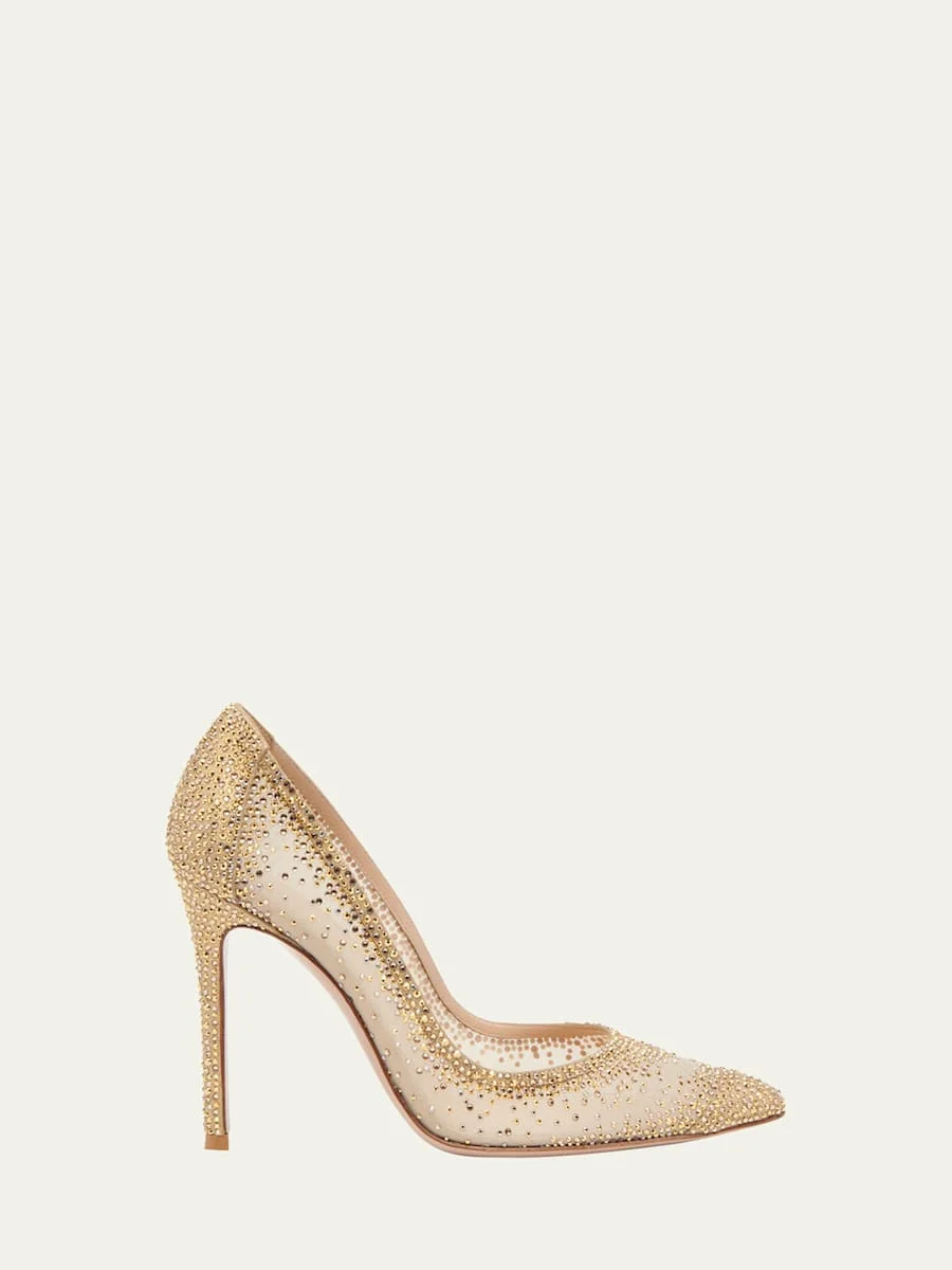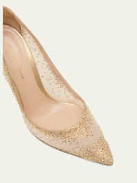 Gianvito Rossi sheer mesh and suede pumps. Allover crystal-stud embellishments. 4.25 in / 105 mm covered stiletto heel. Pointed capped toe. Slip-on style. Leather lining and sole. Spot clean. Made in Italy. Online Inquiries: BGS21_X49KE| Store Inquiries: #2666024