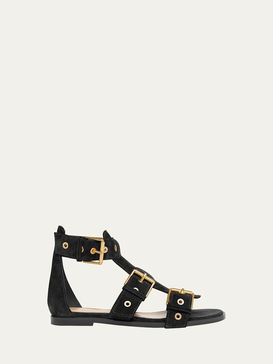 Gianvito Rossi gladiator sandals in suede with goldtone pin buckles and metal grommets 0.17 in / 5 mm flat heel Open toe Tstrap vamp Adjustable ankle strap Leather lining and outsole Spot clean Made in Italy