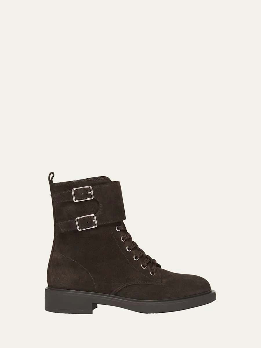 Gianvito Rossi calf suede combat booties 0.75 in / 20 mm flat heel Round toe Lace-up vamp with buckle cuff Side zip eases dress Leather outsole Lining: Leather Made in Italy Online Inquiries: BGS21_X6VVS| Store Inquiries: #5007215
