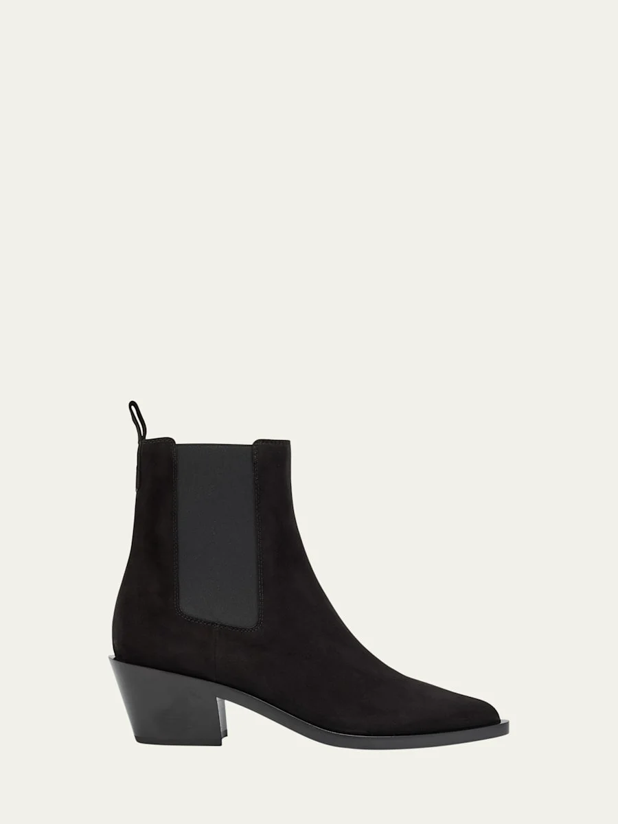 Gianvito Rossi "Wylie" suede western Chelsea ankle booties 1.75 in / 45 mm block heel Pointed toe Gored sides Pull tab at back collar Pullon style Made in Italy