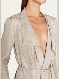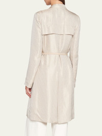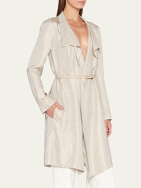 Giorgio Armani metallic wrap coat with a leather thin belt Shawl collar; open front Long sleeves Rainshield back Side split pockets Belted waist Straight fit Knee length Center-back vented hem Viscose/acetate/leather Lining: Viscose Dry clean Made in Italy Model is 5'10"/177cm. Online Inquiries: BGS21_B87EP| Store Inquiries: #4484884