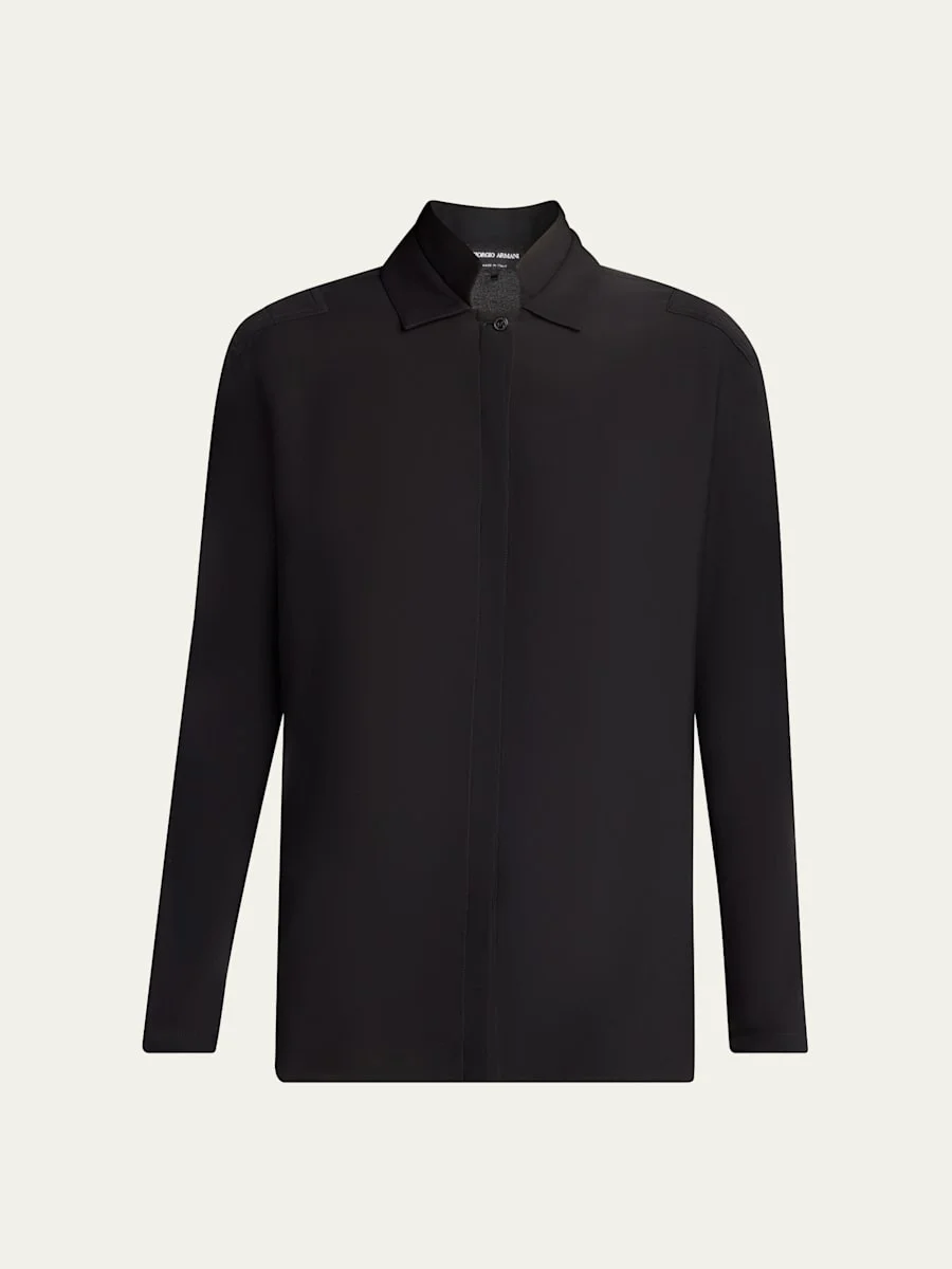 Giorgio Armani blouse in silk georgette with topstitched shoulder patches Double collar; concealed button front Long sleeves Straight hem Relaxed fit Silk Dry clean Made in Italy Online Inquiries: BGS21_T6R9Z| Store Inquiries: #5025076