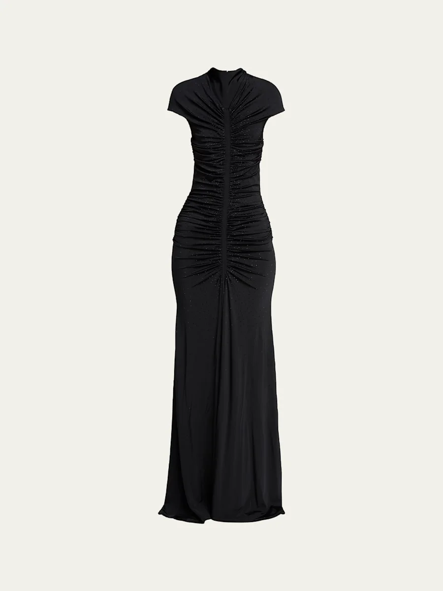 Ruched Cap-Sleeve Rhinestone Gown